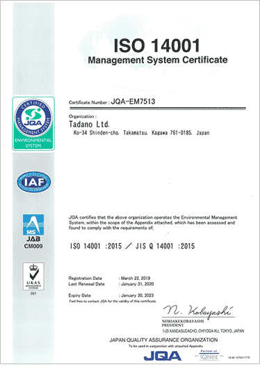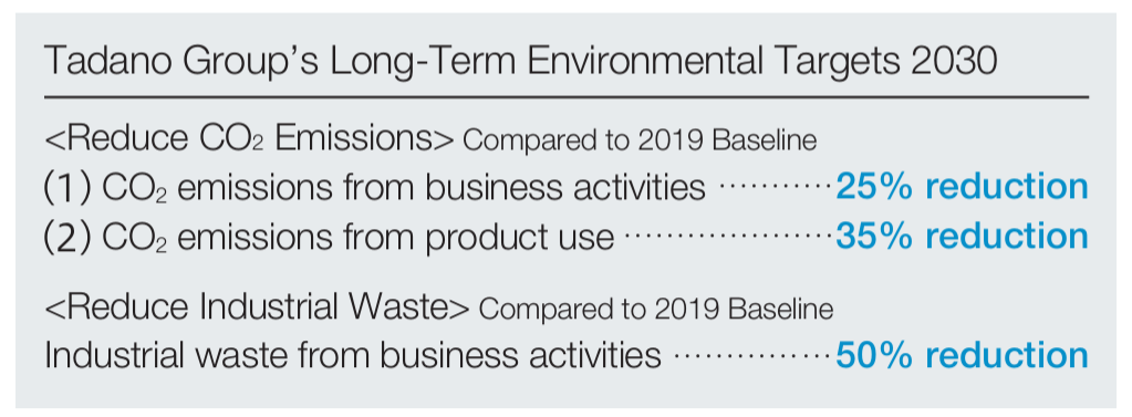 The Tadano Group is working towards improving the global environment from various perspectives, such as initiatives to address climate change, CO2 emissions reduction, industrial waste reduction, conservation of forests and seas, and biodiversity protection. Under the Tadano Group Environmental Policy, “We serve society by promoting cooperation between people, machinery, and the environment,” we are committed to each employee caring for the environment, to the development of green products, and to the provision of green services and environmentally friendly business activities.