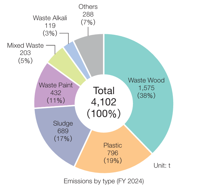 To realize a recycling-oriented society, the Japanese government is promoting the reduction, reuse, and recycling of waste. Since acquiring ISO 14001 environmental management system certification in 2008, the Tadano Group has also been working to reduce industrial waste emissions from its business activities. Approximately 90% of industrial waste in the Tadano Group is generated at production sites. We are working to reduce industrial waste by means including complete sorting of waste, recycling waste to create valuable materials, reducing the use of plastic in part packaging, and making effective use of surplus parts.