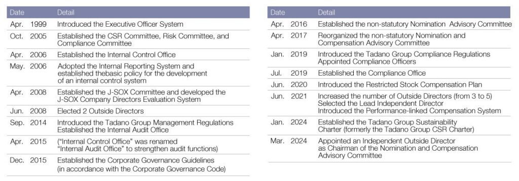 To realize sustainable growth and a mid- to long-term enhancement of corporate value, we have established the Corporate Governance Guidelines, which set forth the Tadano Group’s basic approach to corporate governance.