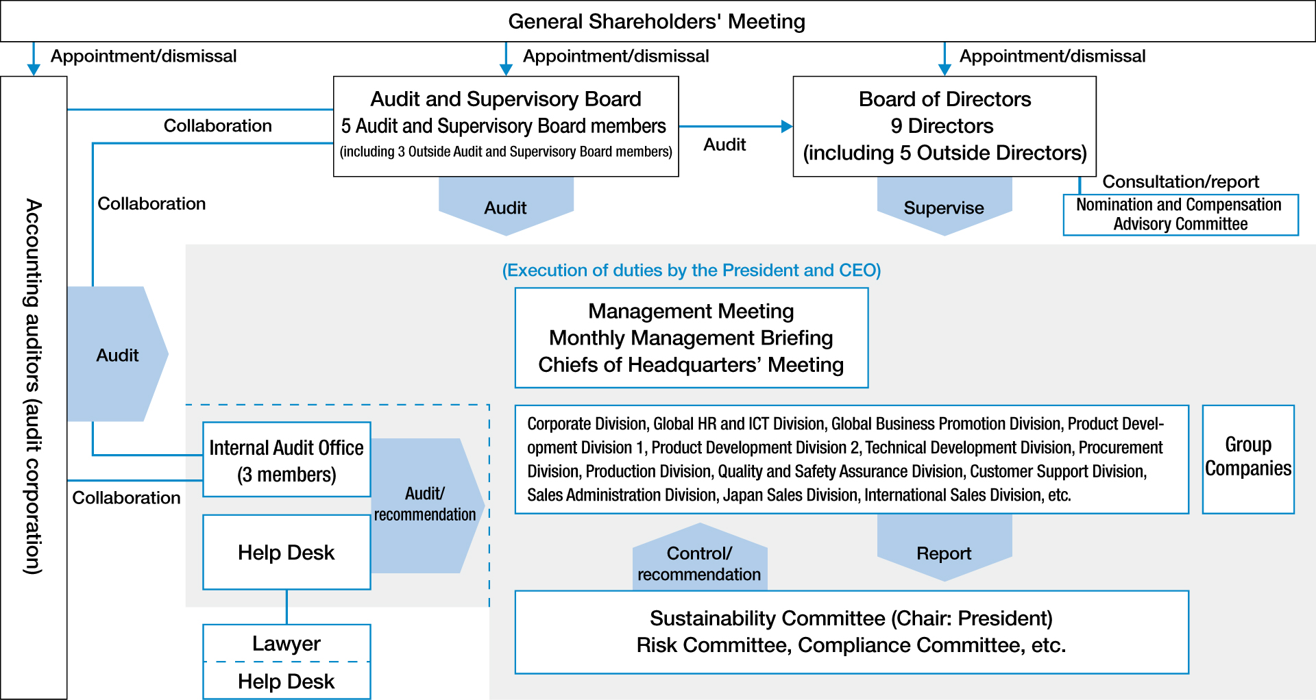 The company places corporate governance as one of the important management issues in order to ensure transparency, soundness, and efficiency of our management. For corporate governance to function effectively, we believe we need to foster a sound corporate culture based on our corporate philosophy and develop a mechanism in which corporate management (and managers) are governed by such a culture. Equally important is to ensure that auditing is conducted properly by improving the auditing environment and expanding the role of the audit and supervisory board members.