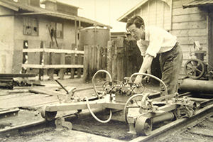 Masuo Tadano, the founder of Tadano, leaves Takamatsu for Asahikawa, Hokkaido, to start a welding business. This day, August 29, 1919, is considered our founding date. At that time, welding technology was rapidly gaining importance and developing outside of Japan, while its introduction in Japan was just beginning. Fascinated by the sparks of welding, Masuo Tadano was convinced that this technology would make a positive contribution to society and took the plunge to establish a company in Hokkaido. (Second from the left: Masuo Tadano.)