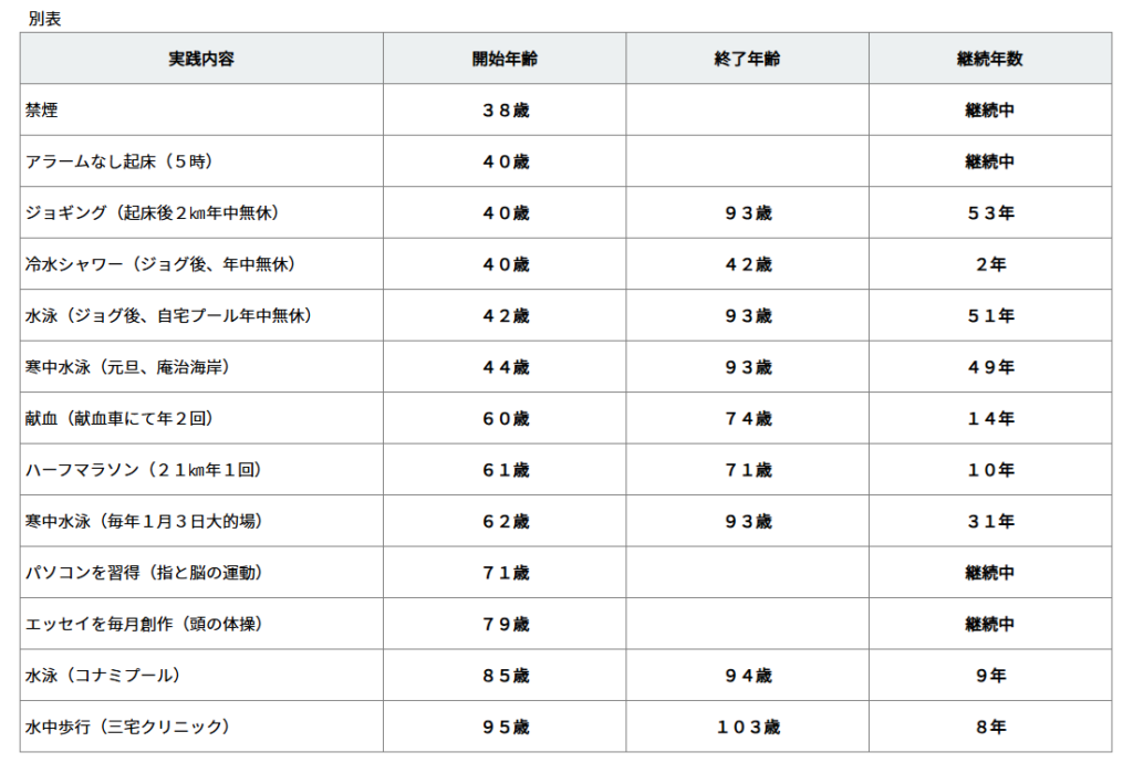 戦後、生かされた命を大事にしようと健康に注力してきたが、それは克己の生き方であった。鈴木大拙師が唱えていた「here now」の今を、今日一日に代えただけだった。気が付いてみると105歳になっていた。別表に示すように、最初38歳に始めた禁煙が成功したので、次第にハードルを高くしていった。それが何十年も続いたのは、意志が強かったからでない。