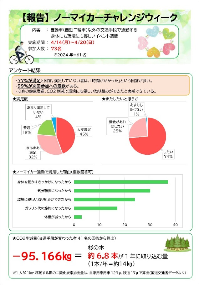 また、春ウォーキング大会に合わせ「ノーマイカーチャレンジウィーク」を開催し、自動車以外の通勤手段(徒歩・自転車・公共交通機関など)を推奨しました。身体にも環境にもやさしい通勤スタイルを推進し、CO₂削減量は「杉の木約6.8本が1年間に吸収する量」に相当することが分かりました。