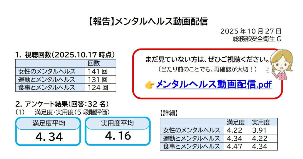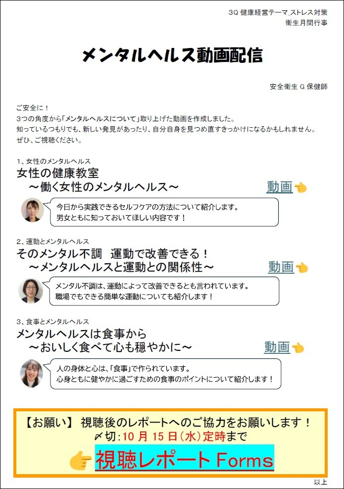 その一環として、衛生月間行事では、保健師3名による「メンタルヘルス動画配信」を実施。