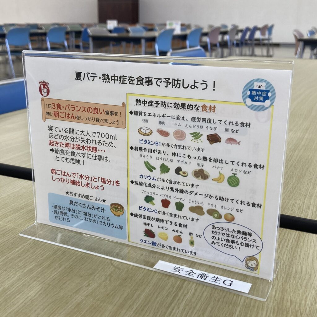 また、社員食堂では「食卓メモ」として、食事に関する情報を掲示。日々の食事を通じて、健康への関心を高める工夫をしています。