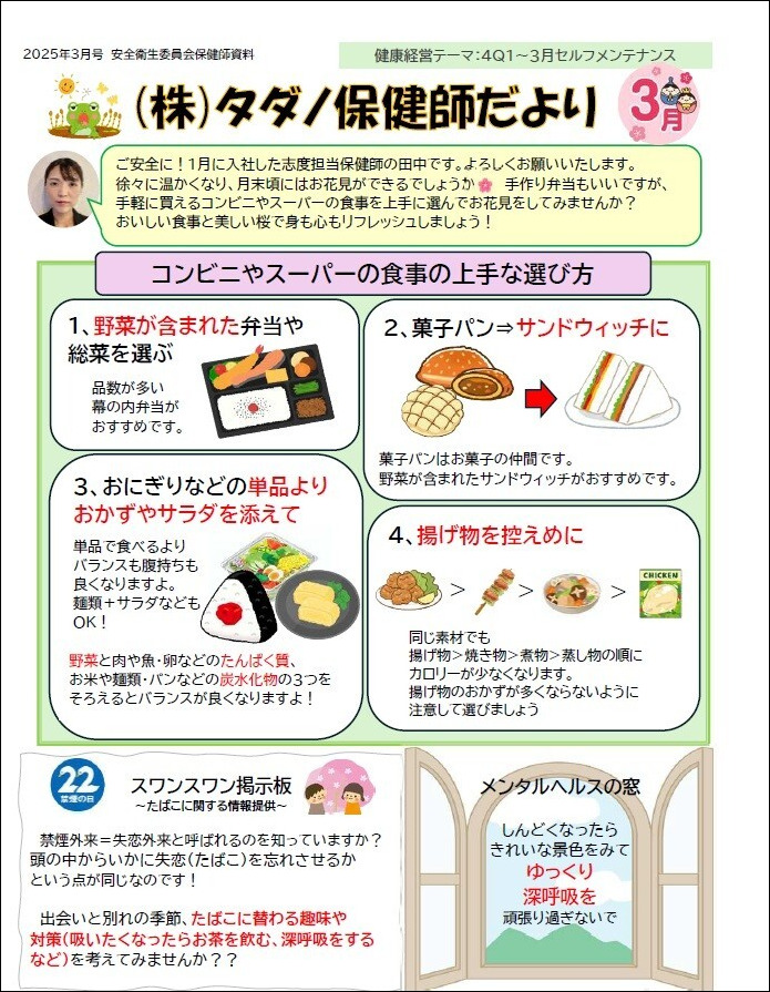 保健師・産業医による「保健師・産業医だより」では、季節やテーマに応じた健康情報を発信し、社員の意識向上を図っています。