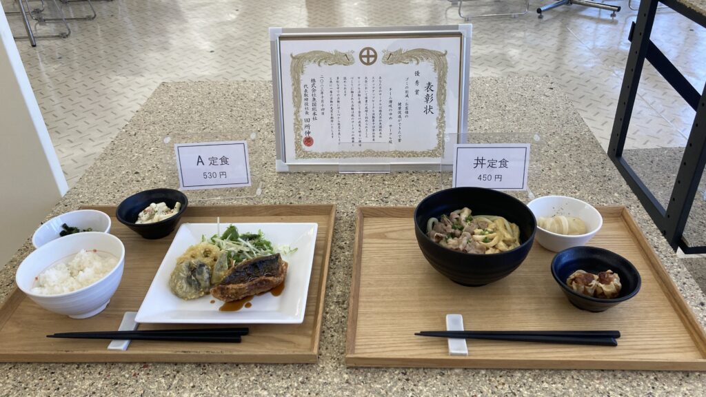 健康に配慮した食事を提供するため、栄養士が献立を作成する専門会社へ業務を委託し、社員が安心して利用できる環境を整えています。2023年には、食堂担当者がサークル活動で「ゴミの削減・お客様の健康促進ができたで賞」優秀賞を受賞しました。