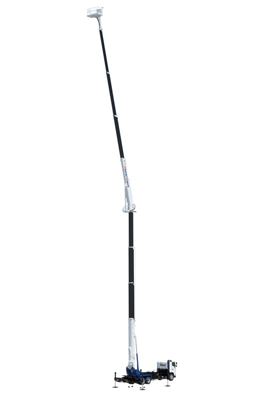 車両は汎用トラック架装の車両総重量25t未満の新規格車として、高速道路や主要幹線道路において通行制限なしで走行可能な車両で、高い機動性を発揮します。また当機の開発にあたっては、ブームをはじめとする主要構造物に対する当社の蓄積された軽量化技術の反映が、車両総重量25t未満で大きな作業範囲を有する高所作業車の実現につながりました。