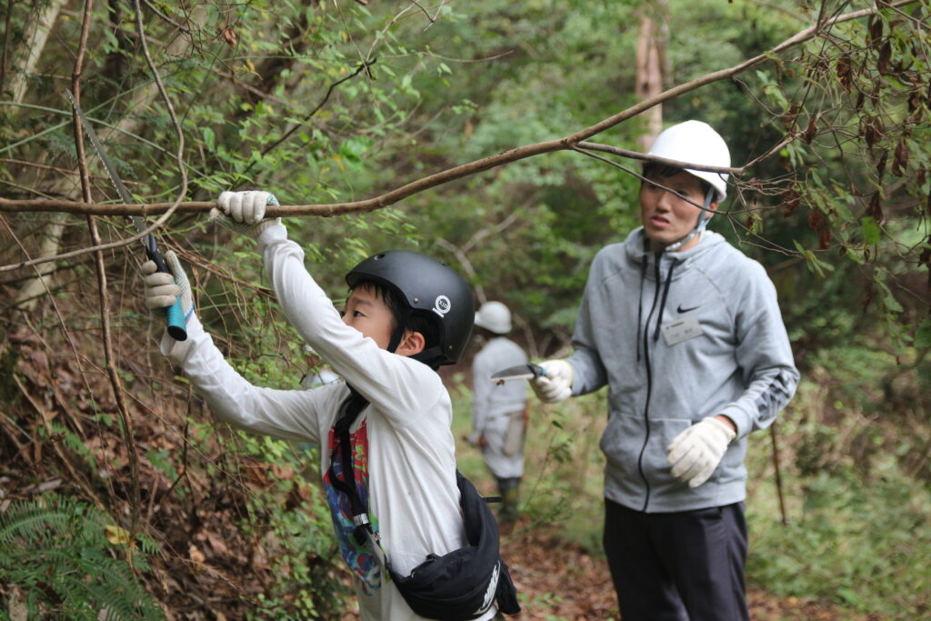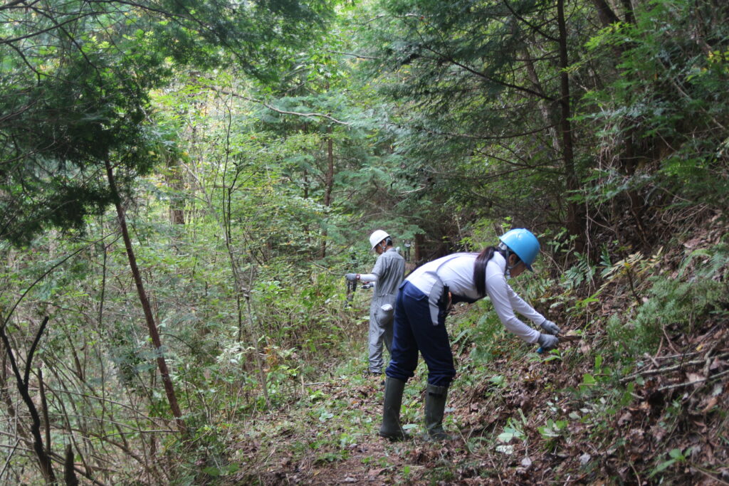 続いて、今回が初めてとなる遊歩道の整備を実施しました。歩行の妨げとなっていた木の枝を参加者が手分けして取り除きました。鎌やのこぎりを使って枝を切り落としたことで、道はすっきりと整い、歩きやすい状態になりました。今回は遊歩道の一部のみの整備となりましたが、今後も引き続き整備を実施し、ウォーキングイベントなどにも活用できるようにしていく予定です。