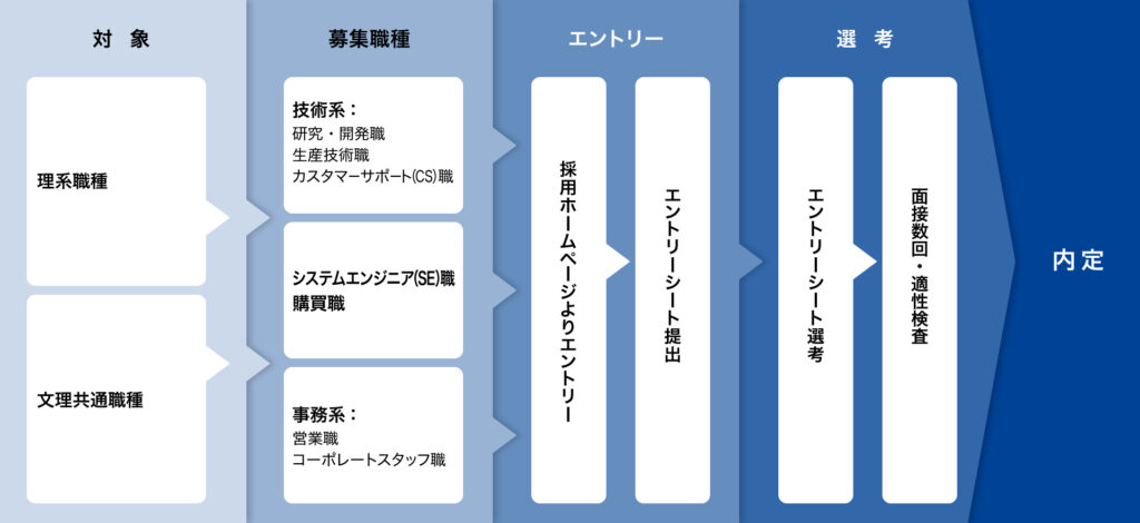| 募集職種 | ①研究・開発職 ②生産技術職 ③カスタマーサポート(CS)職 ④システムエンジニア(SE)職 ⑤購買職 ⑥営業職 ⑦コーポレートスタッフ職 |