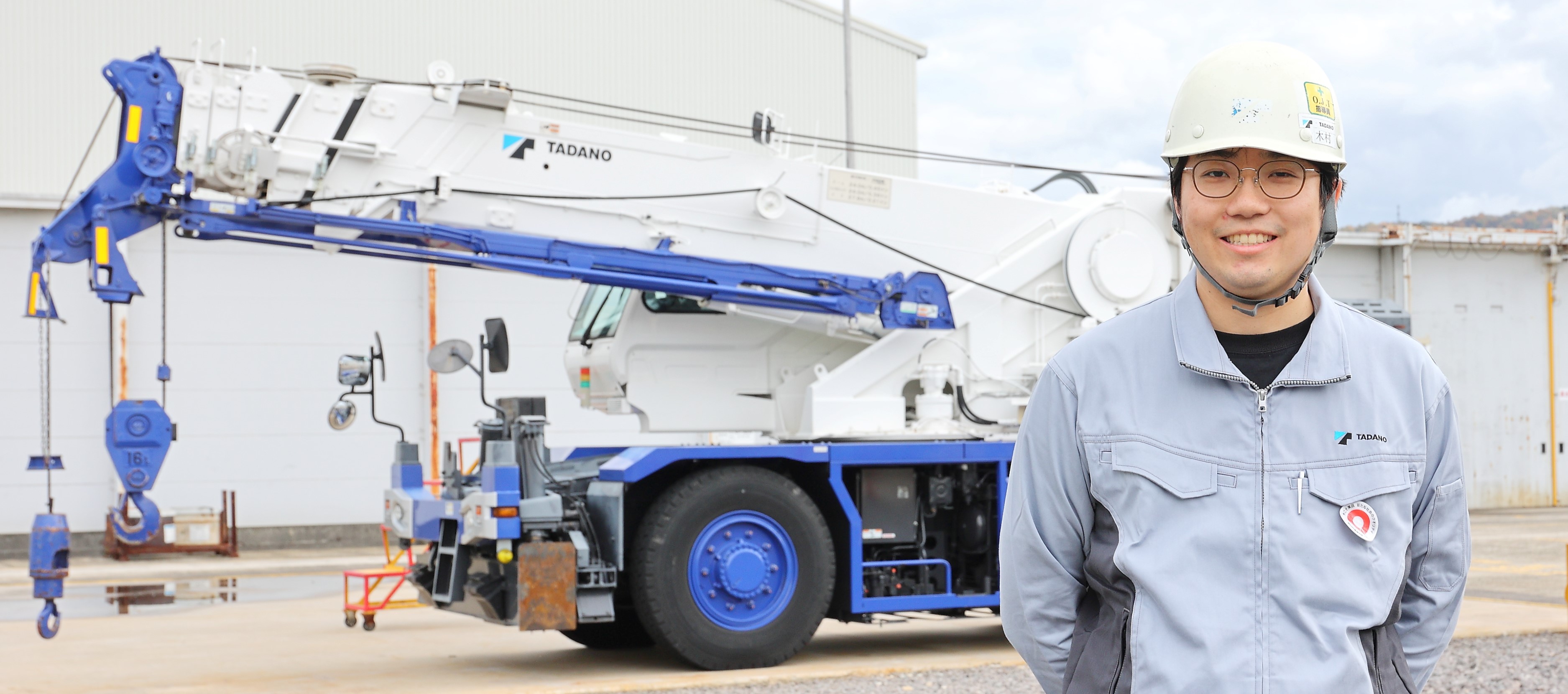 学生時代の2つの体験が、私の将来を決めました。ひとつは、学科で学んだ機械系・電子系の知識を総動員してロボット製作に挑んだ学科内ロボコン。自ら図面を引いてプログラムを組み、試作を重ねながら「将来こんな仕事に就けたら」と、夢が膨らみました。もうひとつは、「ものづくりに関わるなら、スケールの大きいものをやりたい」と思い始めていた4年の時に参加した、タダノの試験インターンシップ。大小さまざまなクレーン、高所作業車、軌陸車などの特殊車両…どれもこれもワクワクする機械ばかりで「絶対この会社に就職したい!」と思い、迷わずタダノを志望しました。